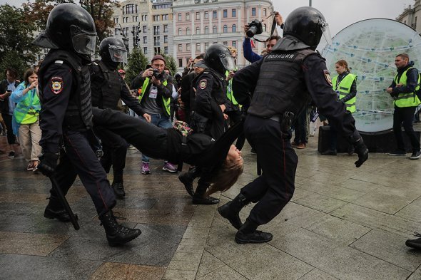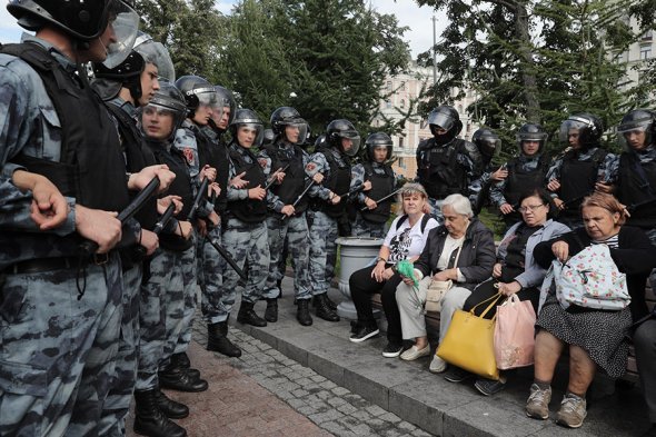 В основном люди аплодировали, выражая таким образом несогласие с действиями полиции. Несколько человек на Тверской улице в знак протеста сели на землю.