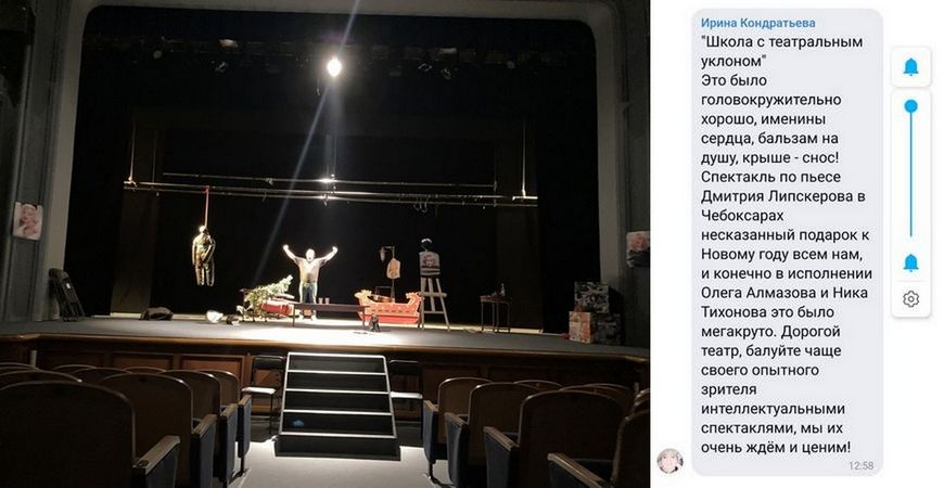 «Я не умею деньги искать / просить , это всегда унижение для меня потому зарабатываю на съёмках и вкладываю в театр / музыку свою и это все в убыток проекты эти , но какой кайф приехать в новый город, развести за три часа свет / звук , взять декорации «из подбора» и сыграть спектакль в удовольствие своё и зрителя 🎭»